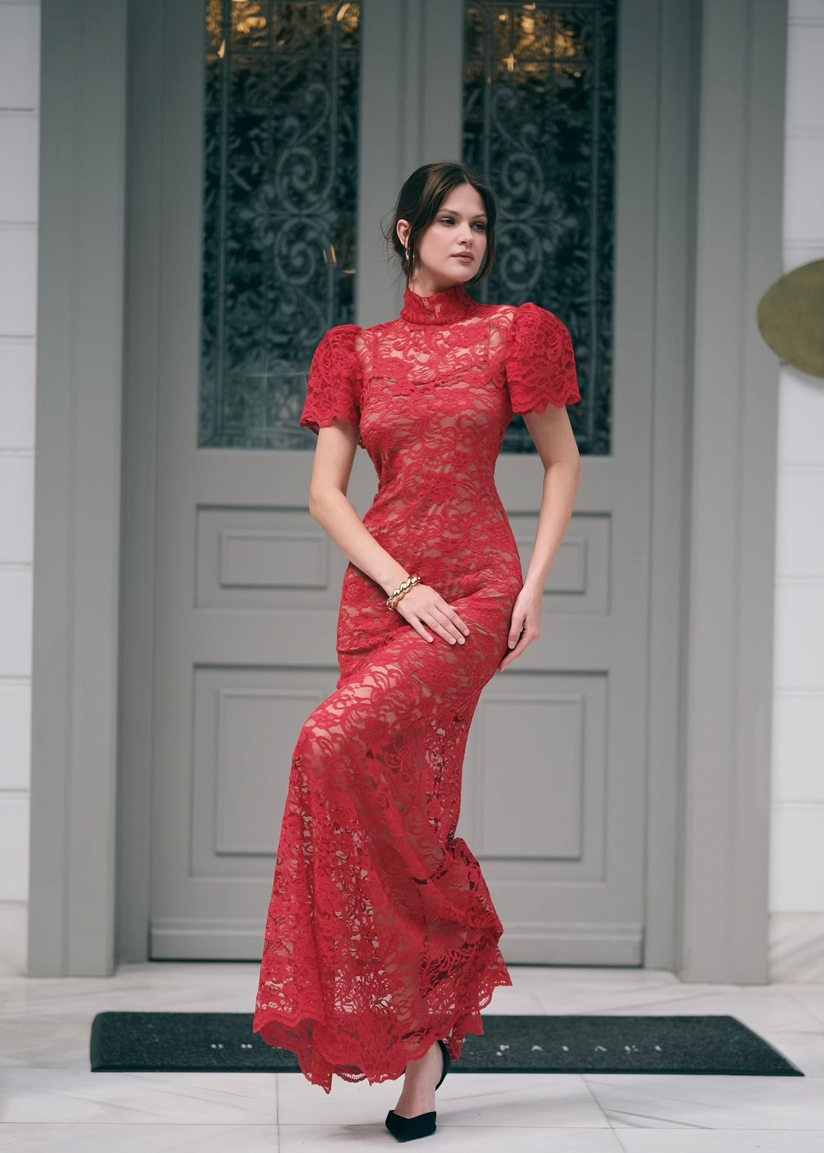Kısa Kollu Dantelli Uzun Kırmızı Elbise