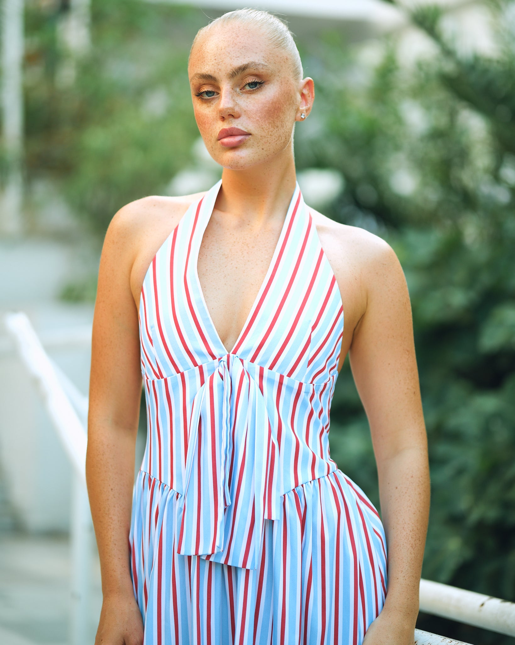 Renkli çizgileri, boyundan bağlamalı tasarımı ve bağcıklı ön detayı ile enerjik bir yaz stiline hazır mısınız? Bu elbise, gün boyu konfor sağlarken görünümünüzü şık ve feminen bir şekilde tamamlar.