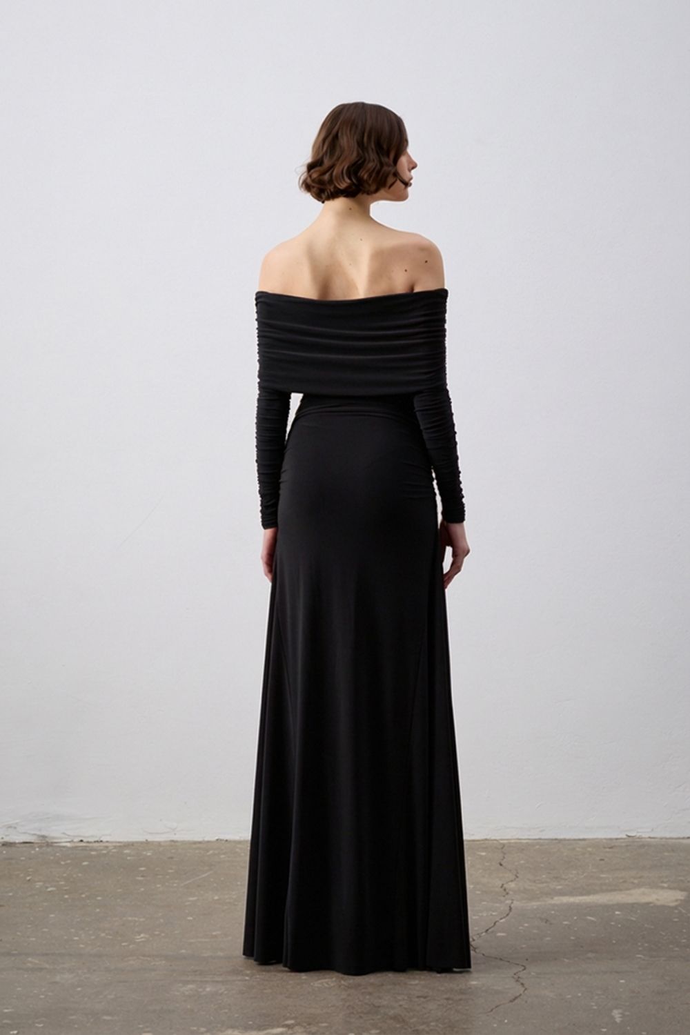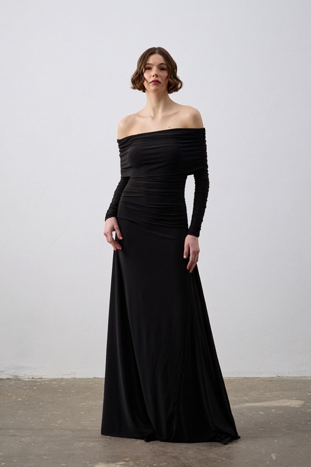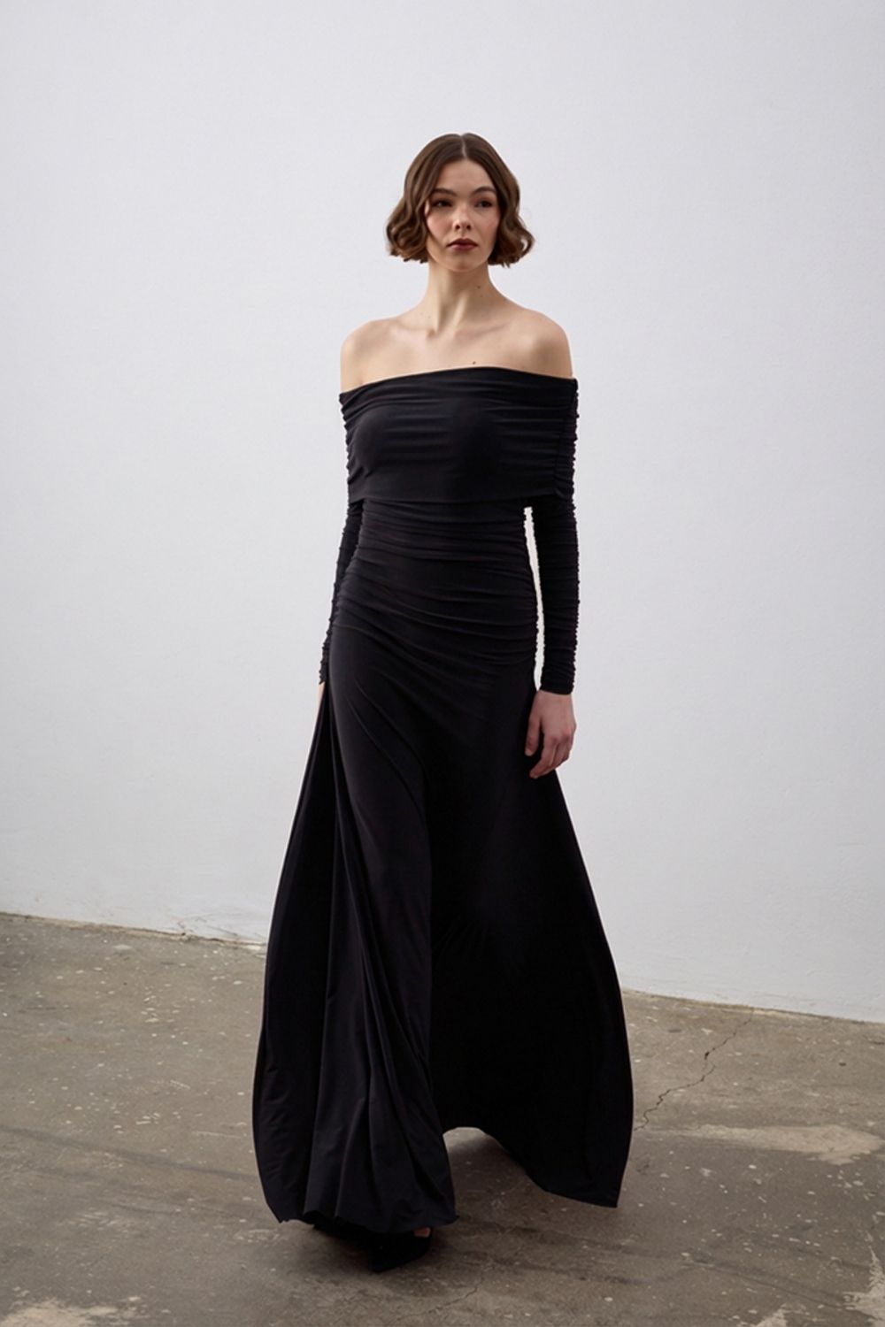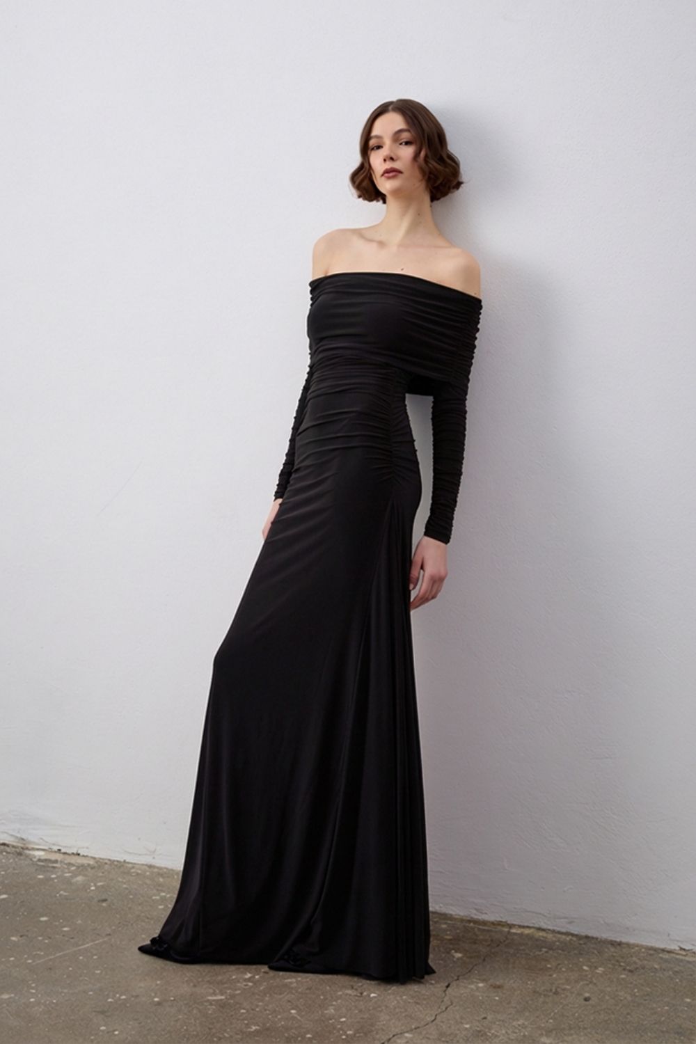 Omuzları açık, geniş kayık yaka detayı ve vücudu saran drapeli formu ile feminen ve iddialı bir siluet sunar. Özel davetlerden nişan, söz ve akşam organizasyonlarına kadar her ortamda göz alıcı bir görünüm sağlar.