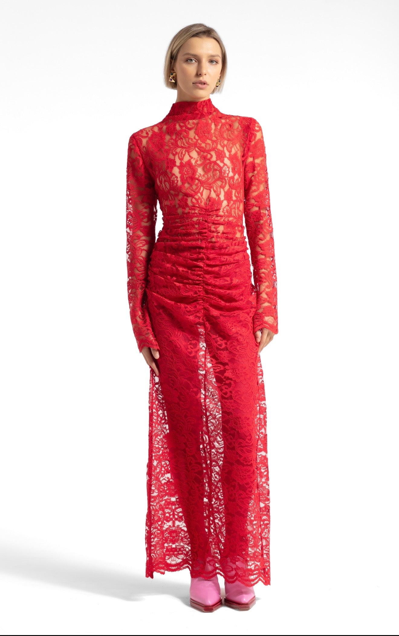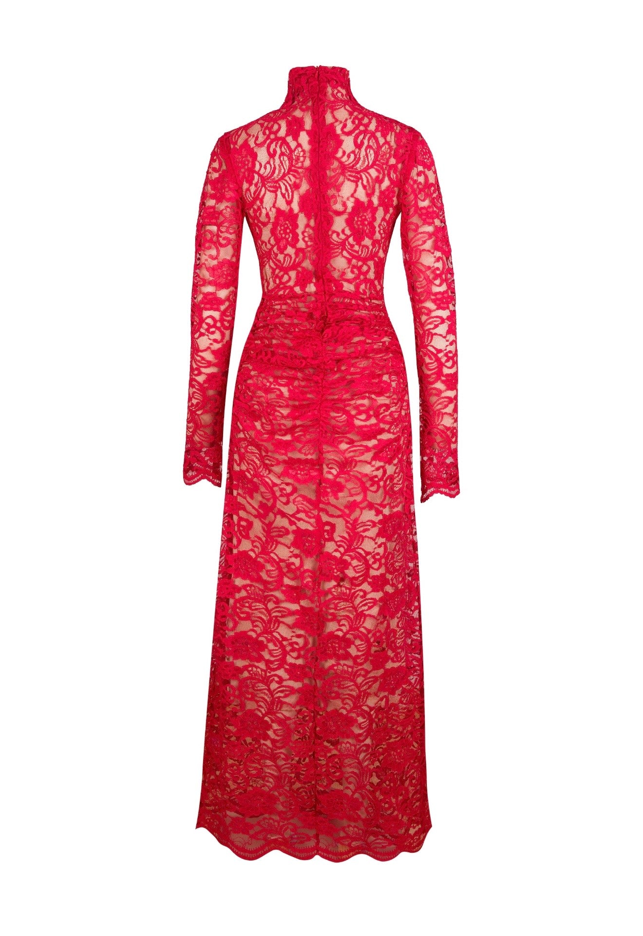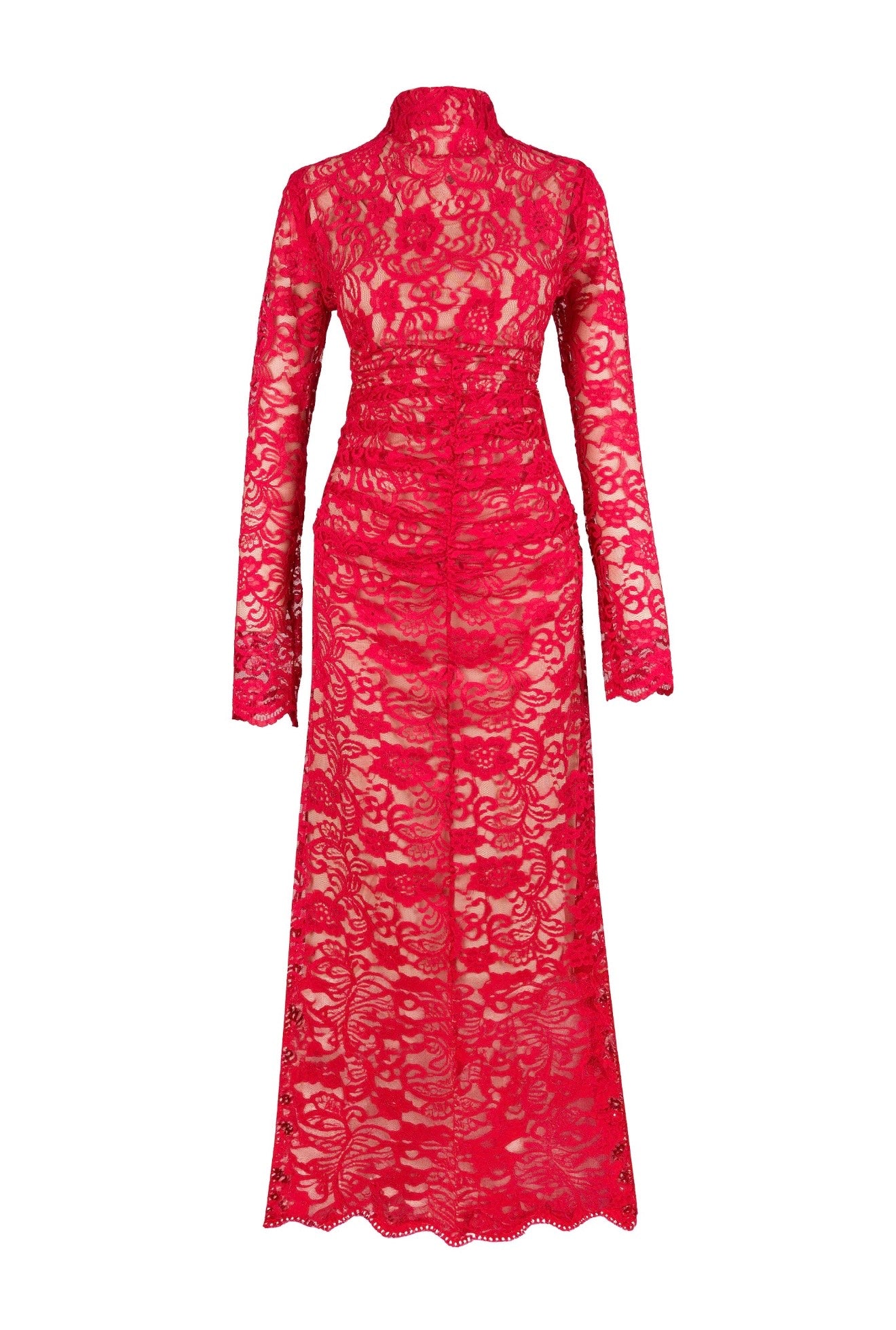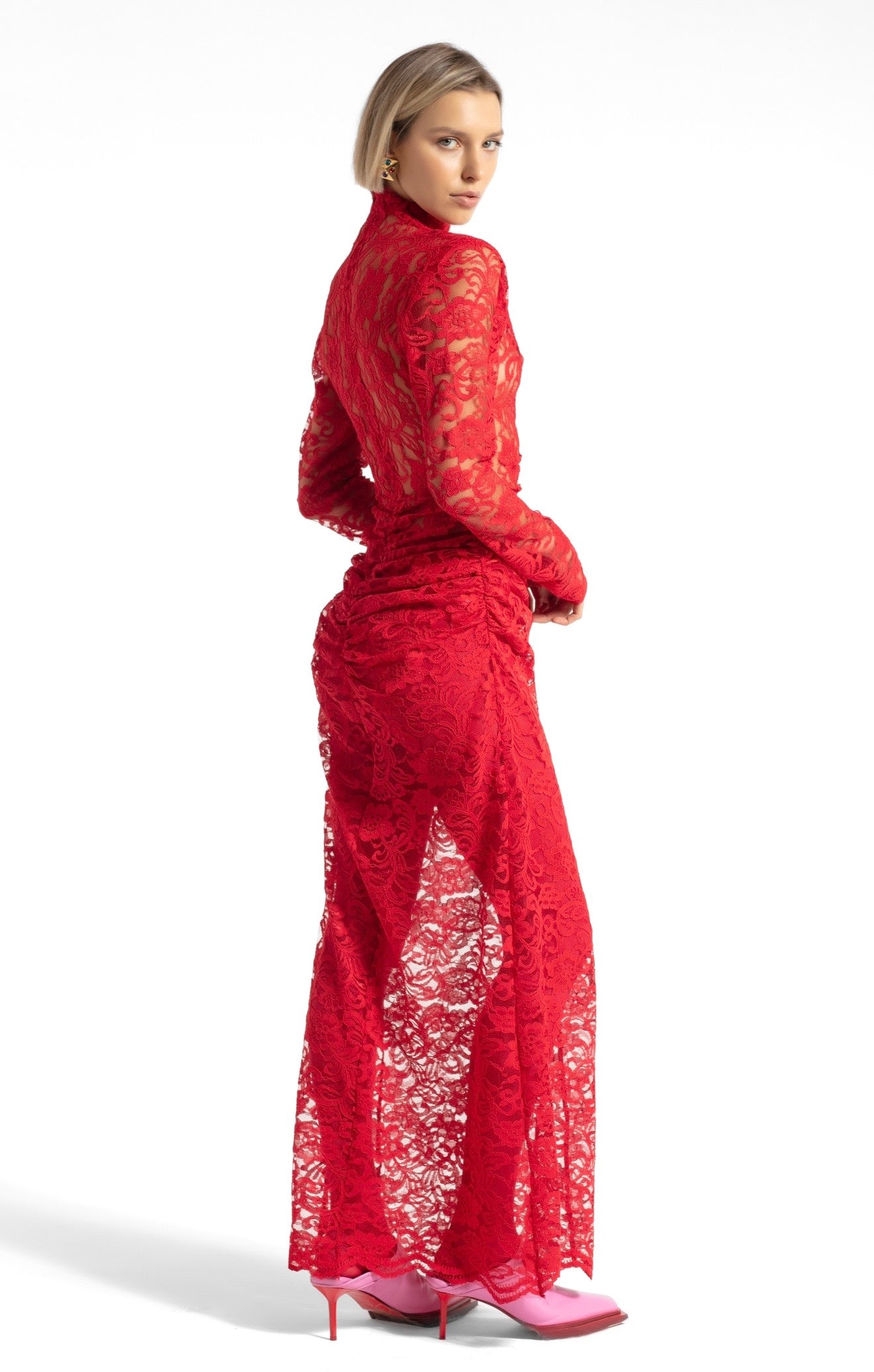 Transparan dantel detaylarıyla feminen ve zarif bir şıklık sunan bu elbise, özel tasarımıyla dikkat çeker.; Gizli fermuar kapama özelliği sayesinde kolay giyilip çıkarılabilir.; Astarsız yapısı, hafif ve özgün bir stil sunarken, şık kombinler için farklı iç giyim seçenekleriyle tamamlanabilir.; Maksi boy tasarımı, zarif ve modern bir duruş sergiler, hem özel günlerde hem de şık davetlerde tercih edilebilir.; Vücuda oturan kesimi, vücut hatlarını nazikçe öne çıkararak zarafet ve şıklığı bir araya getirir.; Dantel kumaşı, şeffaf dokusu ve detaylı işçiliğiyle sofistike bir stil oluşturur.; Uzun kollu ve boğazlı tasarımı, mevsim geçişlerinde şıklığı tamamlarken elegan bir görünüm sunar.; Öneri: Bu ürünün uzun ömürlü kullanımı için yalnızca kuru temizleme yapılması önerilir.