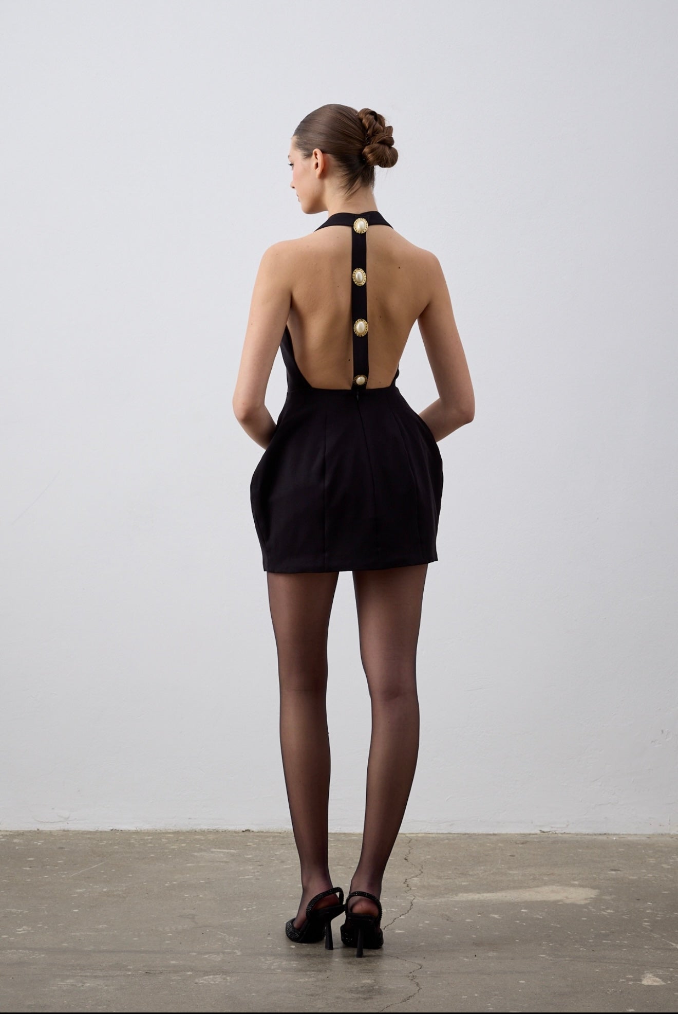 İnci Sırt Dekolteli Mini Siyah Elbise
