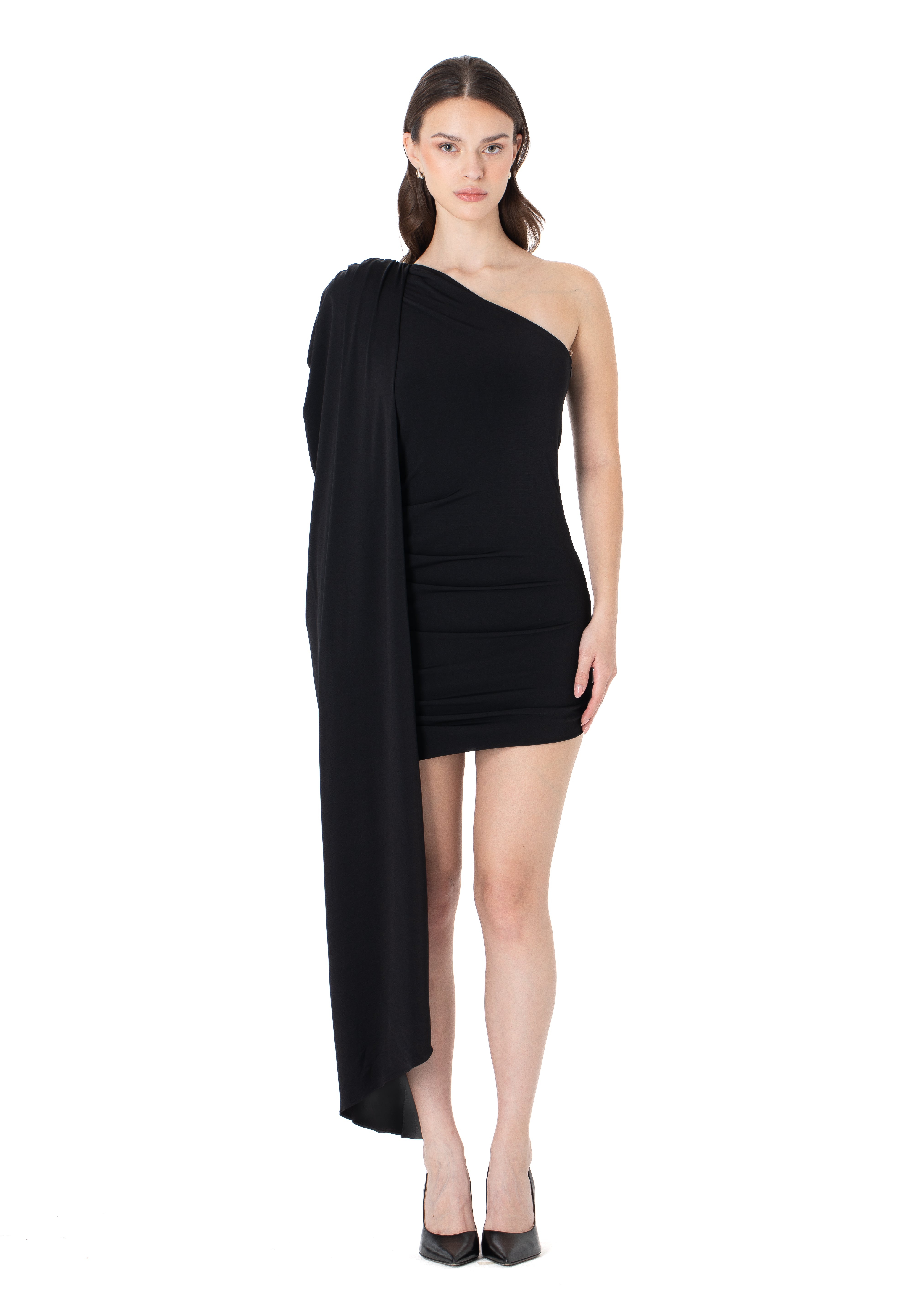 Tek kollu, asimetrik yaka detayına eşlik eden zarif drapeler, vücuda uyum sağlayan premium jarse dokusuyla birleşerek göz alıcı bir görünüm sunar.