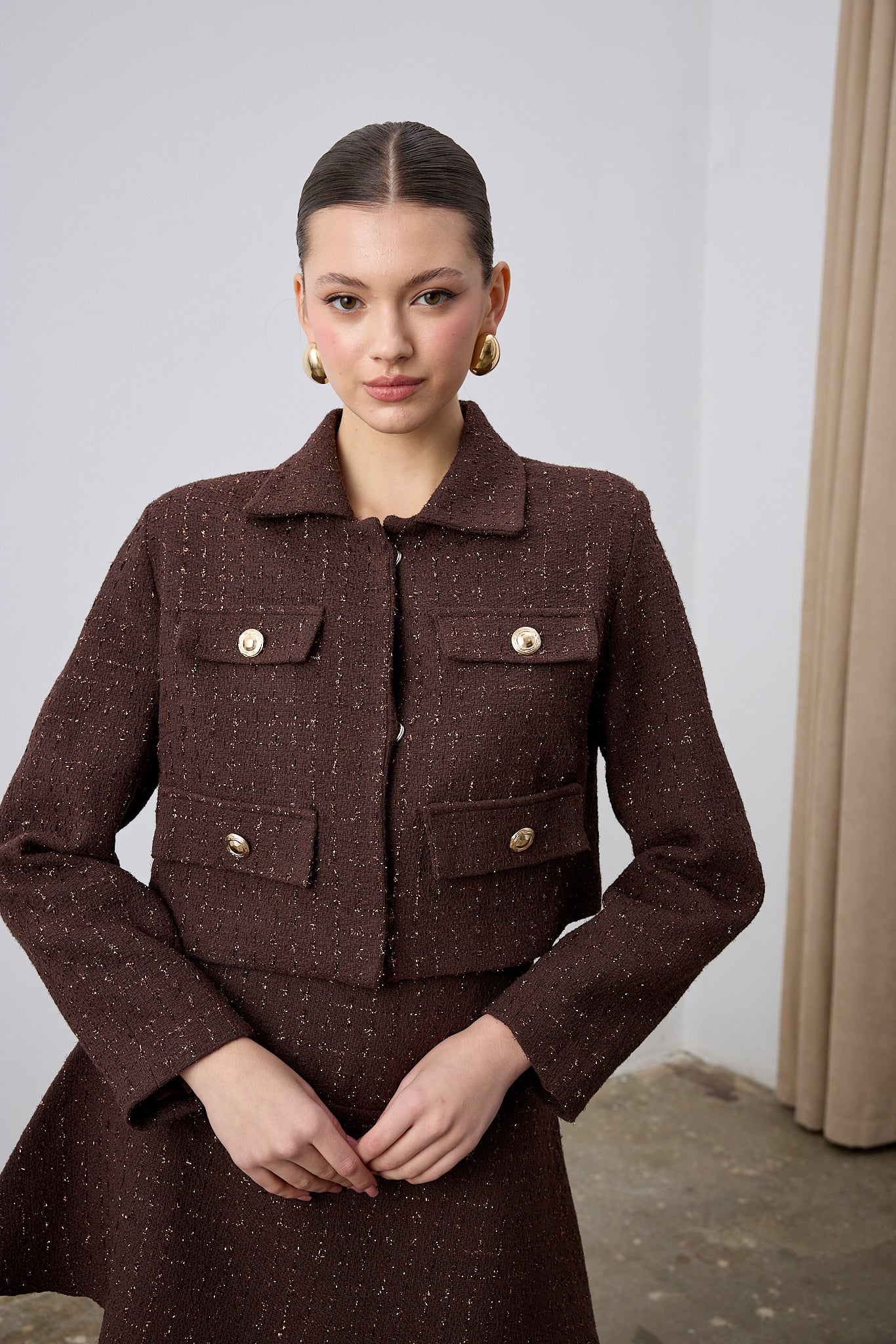 - Günlük kullanım için ideal, hem gündüz hem de gece şıklığınızı tamamlayacak tüvit ceket. Kalın dokusu ile soğuk havalarda sıcak tutan ve konforlu bir deneyim sunar. Kemersiz tasarımı sayesinde modern ve minimalist bir görünüm sağlar. Ceket yakası ile klasik ve zamansız bir stil oluşturur. Düğmeli kapama şekli, kolay kullanım ve pratiklik sunar. Vatkalı yapısı ile omuzları belirginleştirerek feminen bir siluet çizer. Çift kapaklı cep detayları hem fonksiyonel hem de estetik bir dokunuş katmaktadır. Dokuma kumaş tipi, dayanıklılığı artırarak uzun süreli kullanım imkanı tanır. Kadınlar için özel olarak tasarlanmış kısa boy kesimiyle modern ve şık bir görünüm sağlar. Yetişkin yaş grubuna hitap eden tasarım anlayışıyla her ortamda stil sahibi olmanız için idealdir.