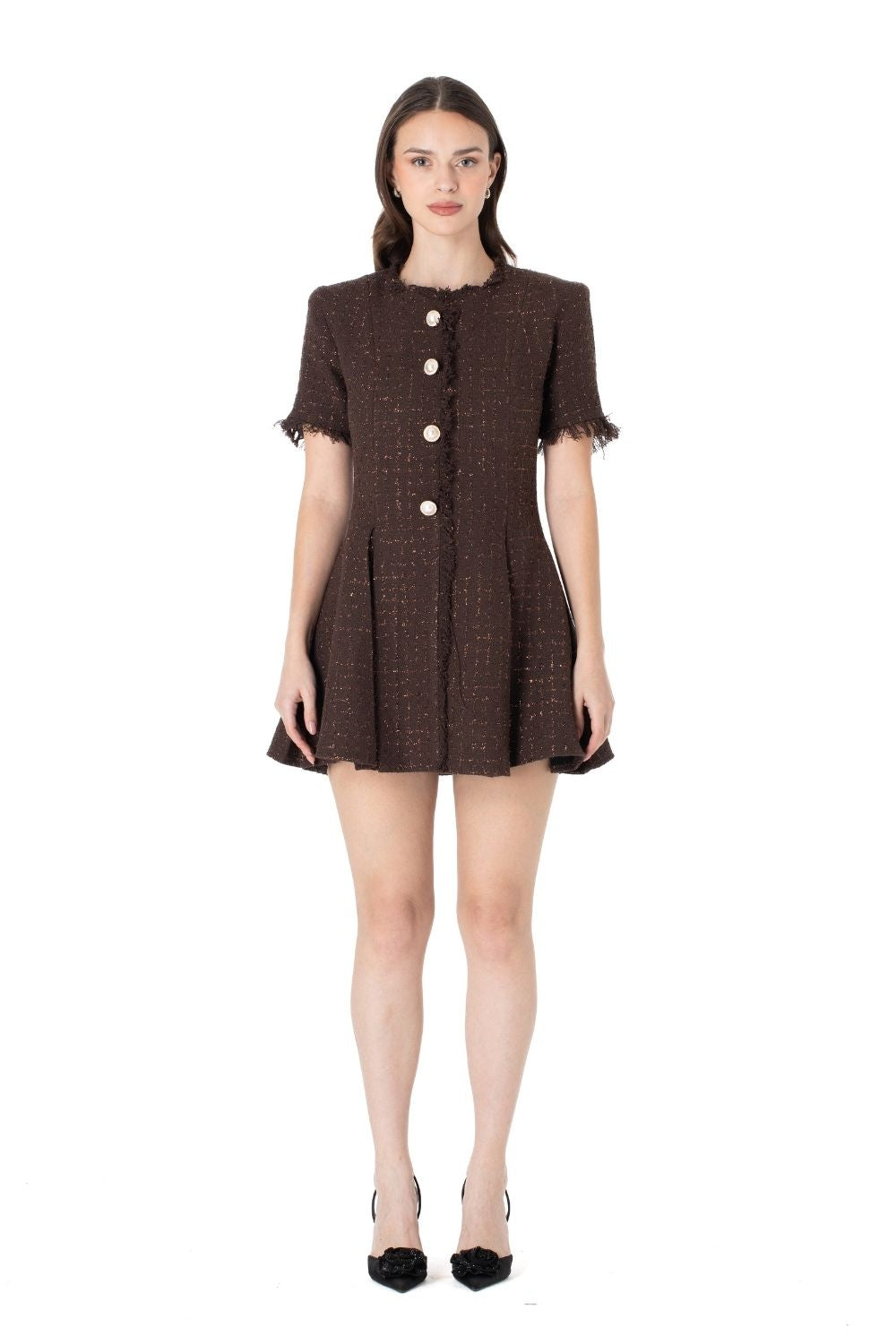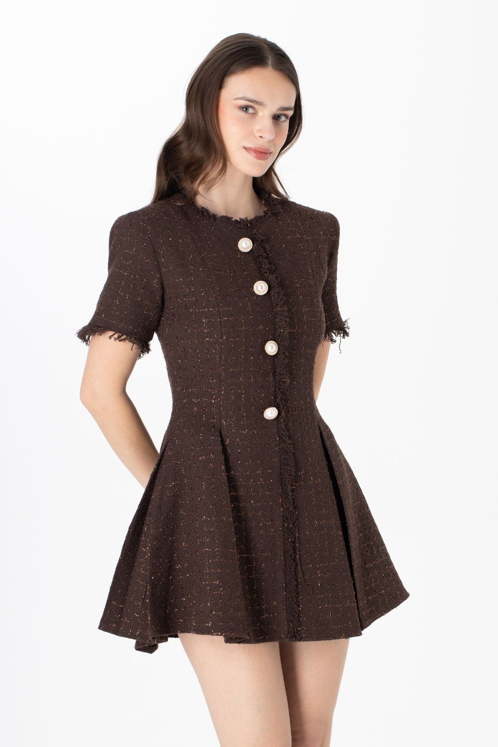 İnce işçiliğin ve seçkin tasarımın buluştuğu İndira Tuvit Mini Elbise, dokuma tuvit kumaşının sofistike dokusunu kusursuz bir silüetle bir araya getirir. Tamamı astarlı yapısı ve özenle yerleştirilmiş dekoratif düğmeleriyle, her ayrıntıda premium bir duruş sergiler. Bel hattını zarifçe vurgulayan kesim, pileli etek formuyla hareketli fakat bir o kadar da elit bir görünüm sunar.