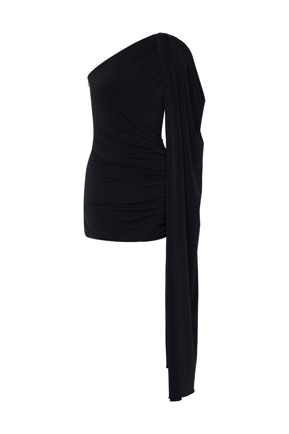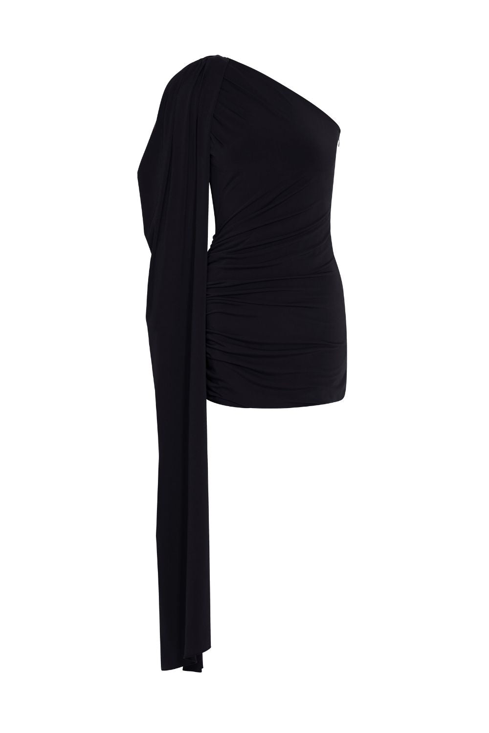 Tek kollu, asimetrik yaka detayına eşlik eden zarif drapeler, vücuda uyum sağlayan premium jarse dokusuyla birleşerek göz alıcı bir görünüm sunar.